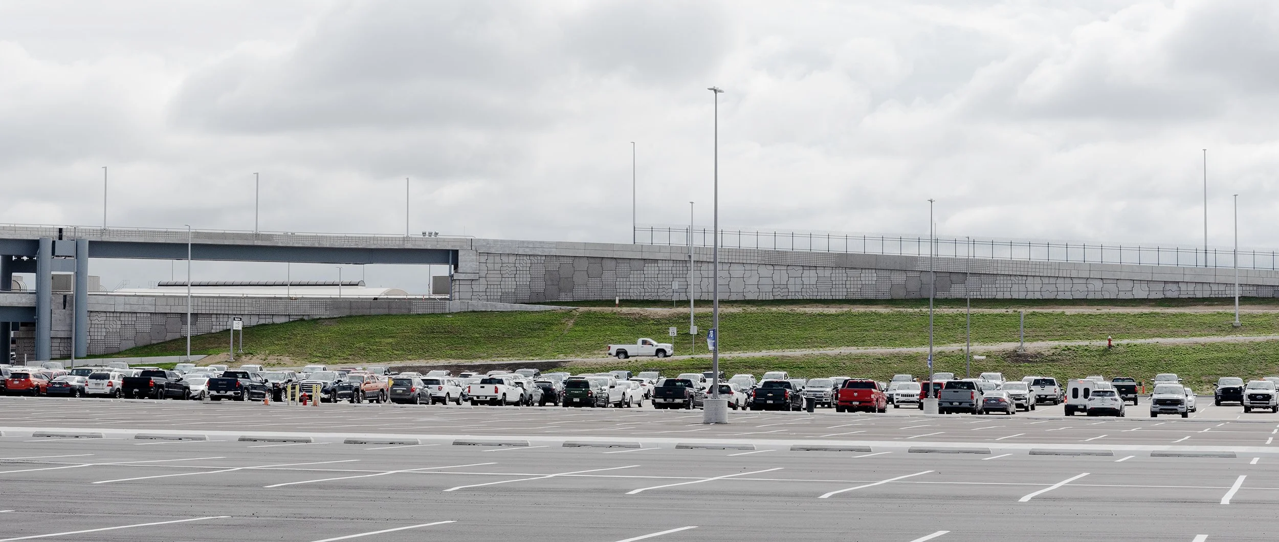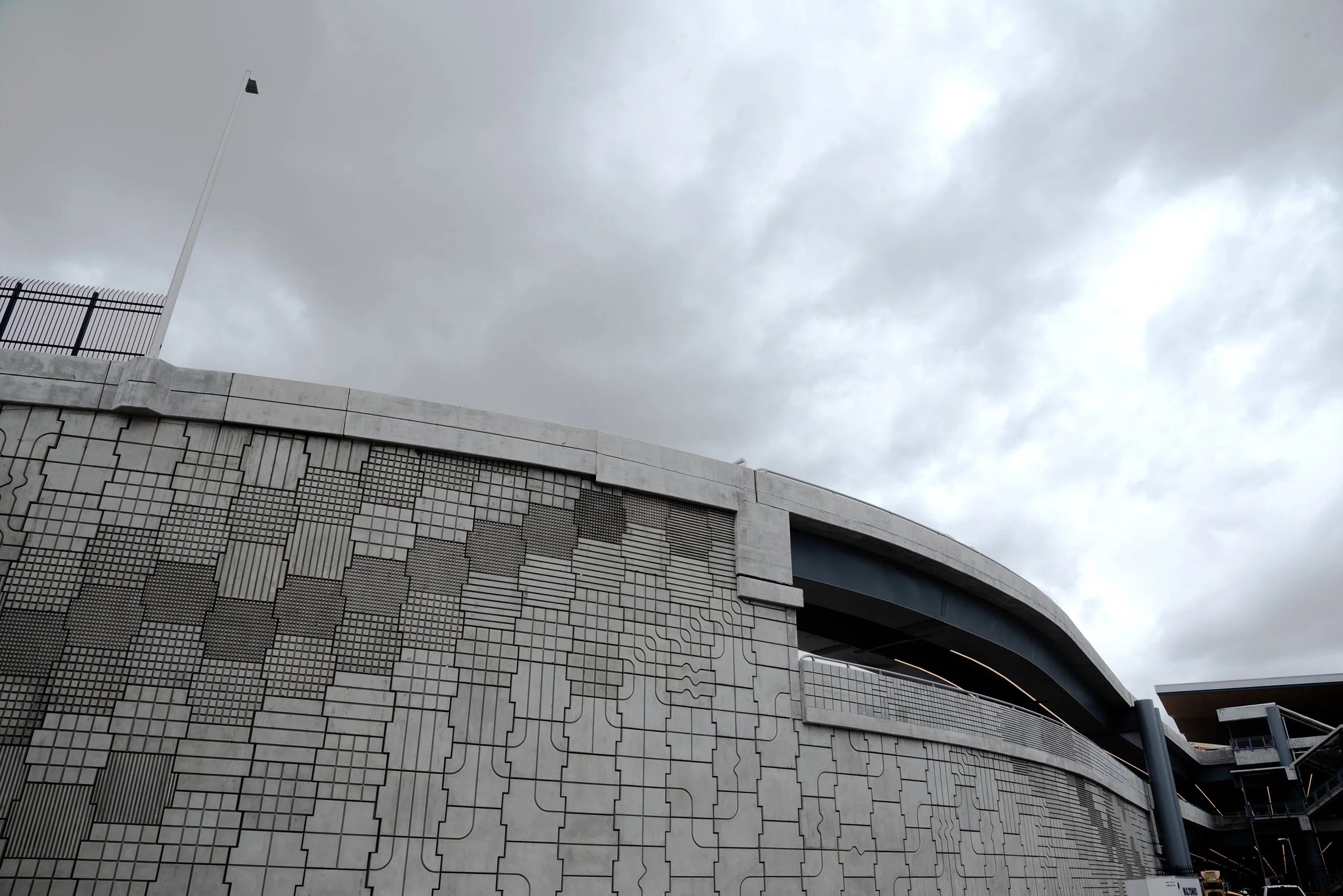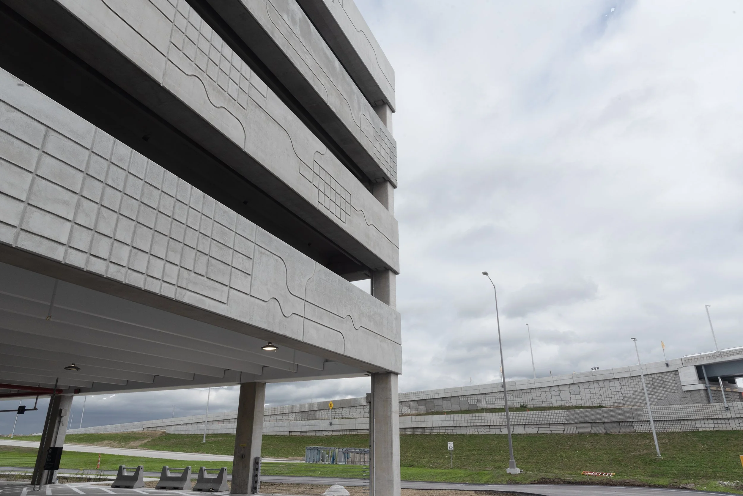 Commissioned by Pittsburgh International Airport, Pittsburgh, PA. Covers 57,000 sf of retaining walls and the entire parking garage facade. Artwork consists of a simple intervantion–scoring lines into the precast concrete panels that make up both structures.